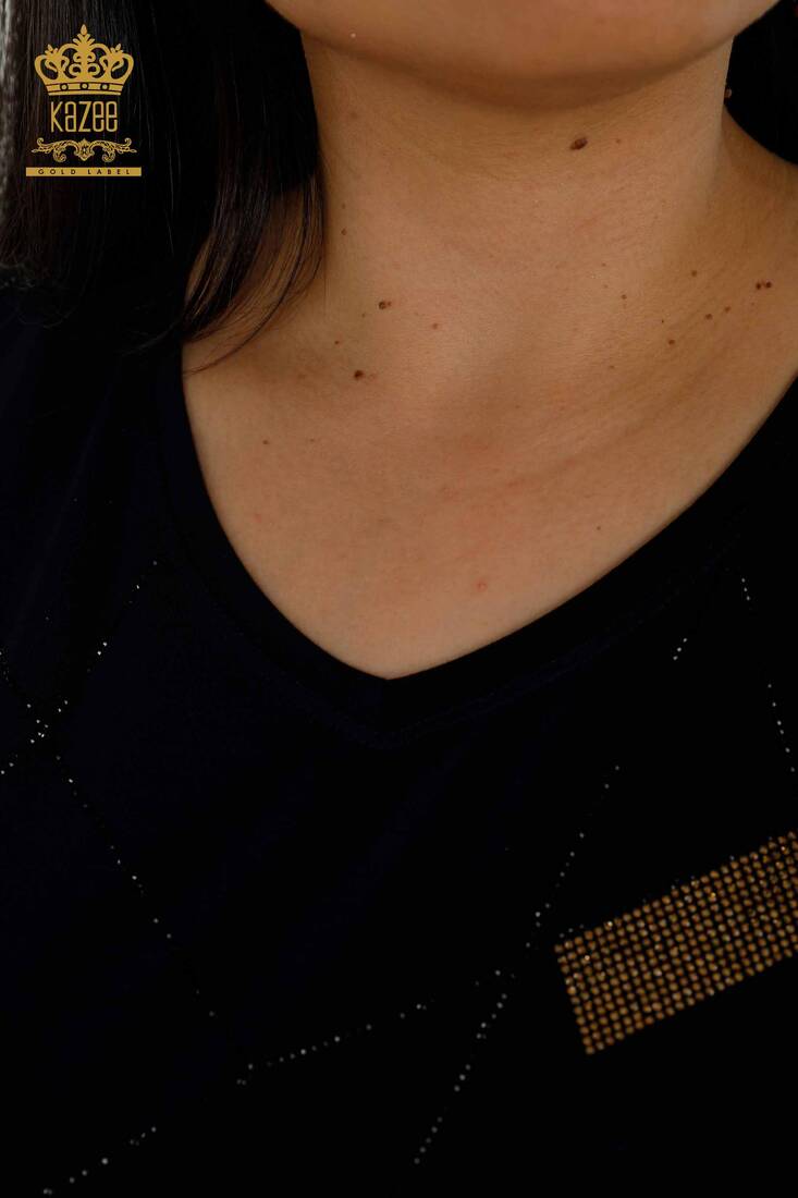 женская блузка с вышивкой камнями и V-образным вырезом, темно-синяя - 79320 | КАЗЕЕ