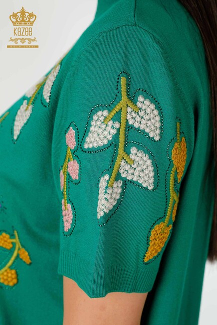 женский трикотаж с цветочным узором, вышитым камнем, стоячий воротник, зеленый - 16753 | КАЗЕЕ